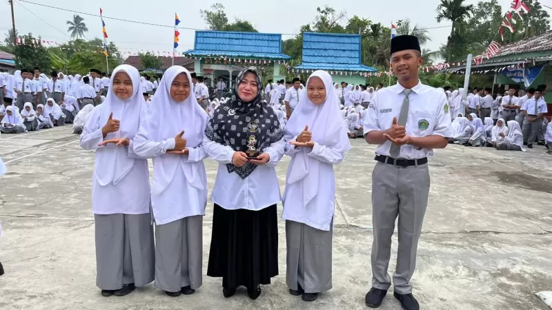 Selatpanjang (mansakati) - Pasca upacara penaikan bendera (26/08/2024) di Lapangan MAN 1 Kepulauan Meranti Nuryaningsih, S.Pd memberikan apresiasi dan menerima kembali 4 orang siswa MAN 1 Kepulauan Meranti sebagai peserta Raimuna Daerah Tahun 2024 di Siak, Provinsi Riau.