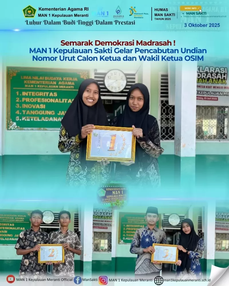 Dengan pencabutan nomor urut ini, tahapan Pemilihan OSIM MAN 1 Kepulauan Meranti periode 2026/2027 resmi dimulai. Seluruh warga madrasah diharapkan dapat berpartisipasi aktif dalam mendukung jalannya proses pemilihan, sehingga lahir pemimpin OSIM yang berkualitas, amanah, dan mampu menjadi teladan bagi seluruh siswa. (Ian)