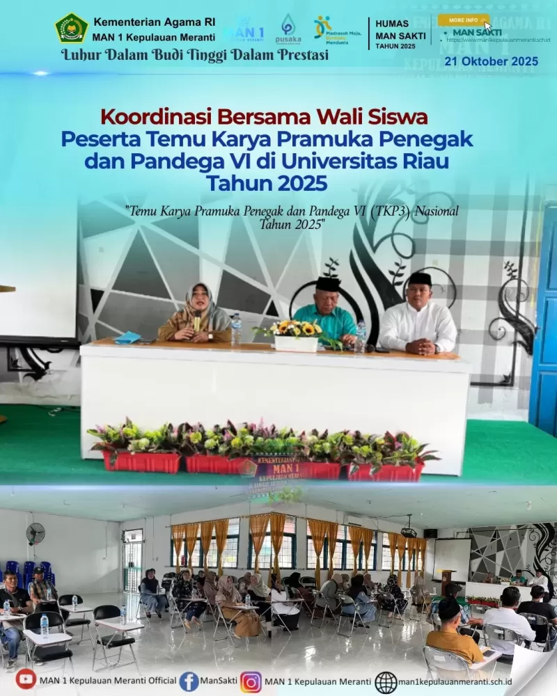 Selatpanjang (Mansakti) — Menjelang keberangkatan peserta Temu Karya Pramuka Penegak dan Pandega (TKP3) VI di Universitas Riau tahun 2025, MAN 1 Kepulauan Meranti menggelar kegiatan koordinasi bersama wali siswa peserta pada Selasa, 21 Oktober 2025 di Aula Al Kindy MAN 1 Kepulauan Meranti. Kegiatan ini dihadiri oleh seluruh wali siswa peserta TKP3 dan dipimpin langsung oleh pembina pramuka sebagai pelaksana kegiatan.
