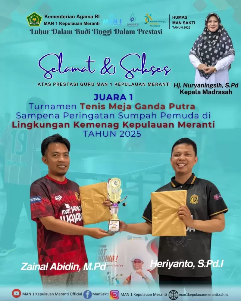 Selatpanjang (Mansakti) – Semangat berprestasi kembali ditorehkan oleh keluarga besar MAN 1 Kepulauan Meranti. Dua guru terbaik madrasah tersebut berhasil meraih Juara 1 Lomba Tenis Meja Ganda Putra pada ajang perlombaan dalam rangka memperingati Hari Sumpah Pemuda Tahun 2025 yang digelar oleh Kantor Kementerian Agama Kabupaten Kepulauan Meranti, Kamis (30/10/2025).