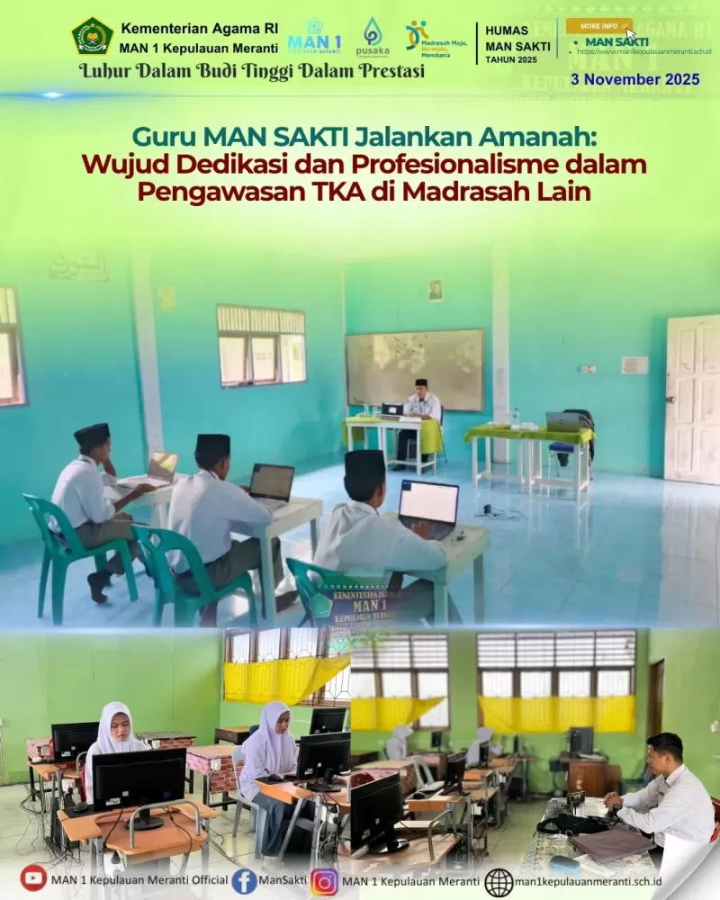 Sebagai utusan resmi dari MAN 1 Kepulauan Meranti, kehadiran kedua guru tersebut menjadi bukti nyata kontribusi dan kepercayaan yang diberikan kepada madrasah ini dalam mendukung suksesnya pelaksanaan kegiatan berskala nasional. Dengan penuh tanggung jawab, mereka menjalankan tugas pengawasan secara profesional di masing-masing lokasi ujian.