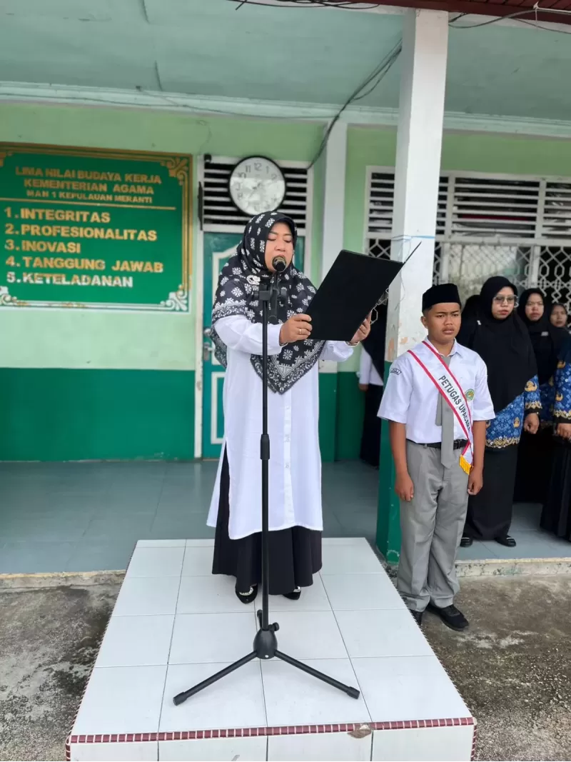 Selatpanjang (Mansakti) - MAN 1 Kepulauan Meranti menggelar kegiatan apel pagi yang dipimpin langsung oleh Kepala Madrasah, Hj. Nuryaningsih, S.Pd, pada Senin, 17 Agustus 2025 di halaman madrasah. Kegiatan yang diikuti oleh seluruh civitas akademika MAN 1 Kepulauan Meranti ini dilaksanakan oleh kelas X Ibnu Sina dengan pendampingan guru Siti Maria Ulvah, S.Pd.