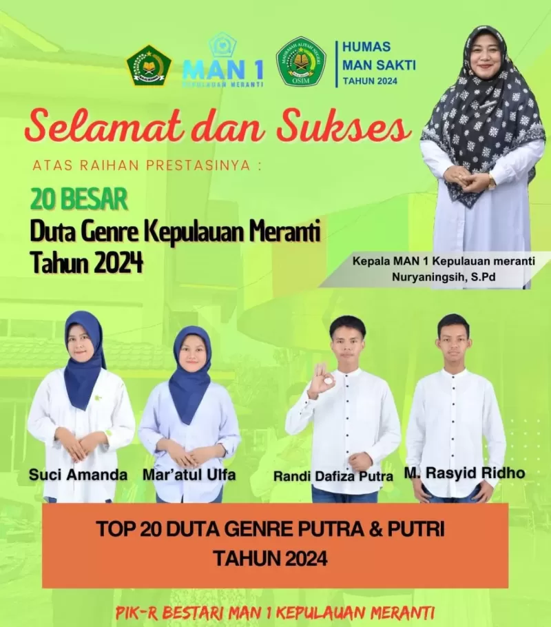 Pada kesempatan kali ini MAN 1 Kepulauan Meranti mengutus 6 peserta calon duta genre terdiri dari 2 laki-laki dan 4 perempuan. ( Randi daviza putra, M. Rasyid Ridho, Rahayu Safitri, Ghaitsa Lutfiyah Mumtaz, Suci Amanda Nurhalima dan Maratul Ulfa). Dari ke 6 calon peserta tersebut 4 orang berhak melaju ke Top 20 Calon Duta Genre Meranti, yaitu Randi Daviza Putra, M. Rasyid Ridho, Suci Amanda Nurhalima, dan Maratul Ulfa dan sudah menyelesaikan tahapan interview.