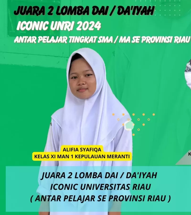 Selatpanjang (Mansakti) - Siswi Madrasah Aliyah Negeri (MAN) 1 Kepulauan Meranti Kelas XI Esacle bernama Alifia Syafiqa Juara 2 Lomba Dai Daiyah Tingkat Provinsi melalui Online yang di taja oleh Universitas Riau.