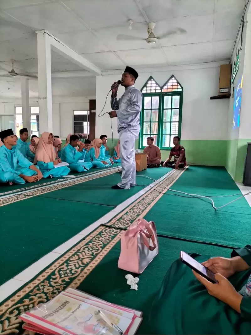 Siswa kelas X mengikuti sesi materi yang mengangkat tema kearifan lokal, khususnya permainan tradisional. Kegiatan ini berlangsung di Mushalla madrasah dan dipandu oleh narasumber dari Fasilitator dan Koordinator. Dalam sesi ini, para siswa tidak hanya diperkenalkan dengan budaya lokal, tetapi juga diberikan kesempatan untuk langsung berdiskusi. Melalui pengenalan budaya melayu ini, siswa diajak untuk mengenal lebih dekat warisan budaya daerah mereka serta menanamkan nilai-nilai kebersamaan dan sportivitas.