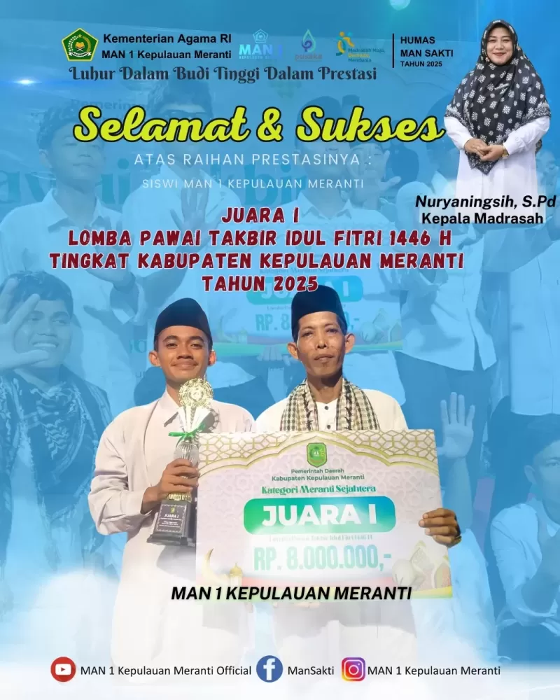 Selatpanjang (Mansakti) - MAN 1 Kepulauan Meranti berhasil meraih juara 1 pada lomba pawai takbir idul fitri yabg di adakan oleh pemerintahan Kabupaten Kepulauan Meranti pada hari minggu (30/04/2025)