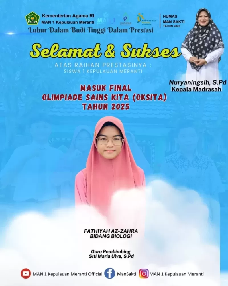 Selatpanjang (Mansakti) – Fatiyah Az-Zahra siswi Madrasah Aliyah Negeri (MAN) 1 Kepulauan Meranti sukses masuk Final Olimpiade Sains Kita (Education And Training Center) bidang biologi yang diadakan oleh Kita Center bekerjasama dengan Dosen Universitas Riau Tahun 2025 untuk tingkat SD, SMP dan SMA/ MA.