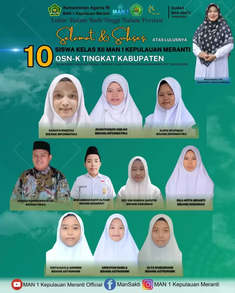 Selatpanjang (Mansakti) -- Sepuluh siswa MAN 1 Kepulauan Meranti lolos seleksi Olimpiade Nasional (OSN) Tingkat Kabupaten, dan lanjut bersaing di OSN Tingkat Provinsi Jenjang SMA/MA Tahun 2025 pada hari Selasa (15/07/25).