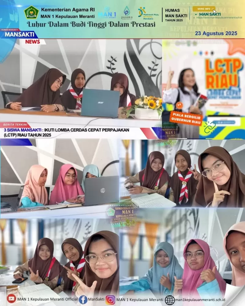 Selatpanjang – Tiga siswa Madrasah Aliyah Negeri (MAN) 1 Kepulauan Meranti turut berpartisipasi sebagai peserta Lomba Cepat Tepat Perpajakan (LCTP) Riau Tahun 2025 yang diselenggarakan oleh Kantor Wilayah Direktorat Jenderal Pajak (Kanwil DJP) Riau. Kegiatan yang berlangsung secara daring melalui aplikasi Zoom Meeting ini dilaksanakan pada Rabu dan Jumat, 20 serta 22 Agustus 2025.
