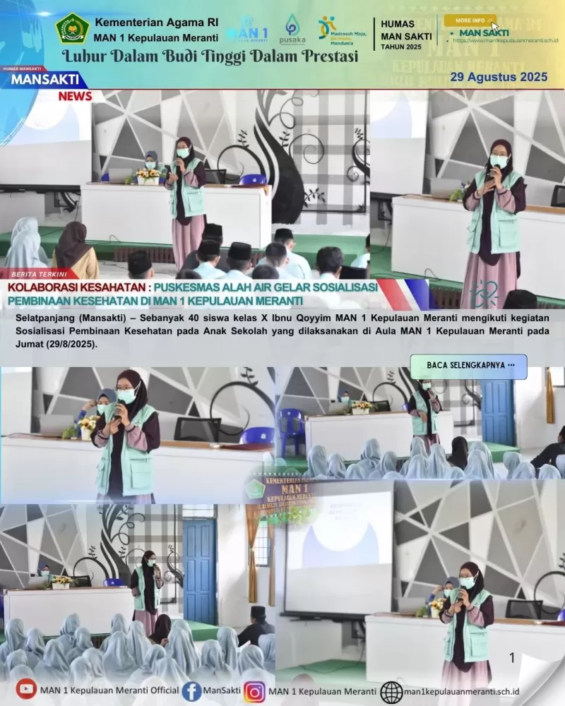 Selatpanjang (Mansakti) – Sebanyak 40 siswa kelas X Ibnu Qoyyim MAN 1 Kepulauan Meranti mengikuti kegiatan Sosialisasi Pembinaan Kesehatan pada Anak Sekolah yang dilaksanakan di Aula MAN 1 Kepulauan Meranti pada Jumat (29/8/2025).