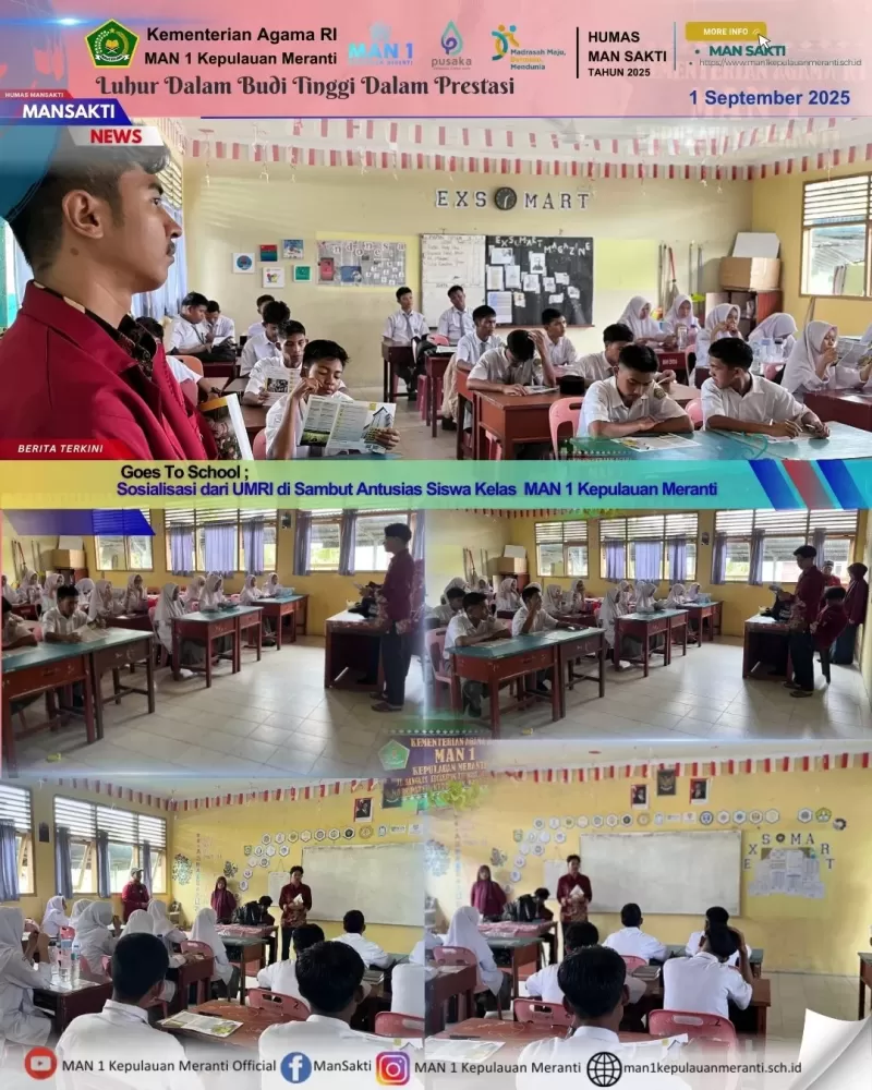 Seluruh siswa kelas XII MAN 1 Kepulauan Meranti mengikuti kegiatan sosialisasi dari Universitas Muhammadiyah Riau (UMRI) yang berlangsung pada Selasa, 2 September 2025. Kegiatan ini digelar di ruang kelas XII Genius dan mendapatkan sambutan hangat serta antusiasme tinggi dari para siswa.