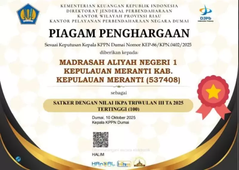 Dumai (Mansakti) – MAN 1 Kepulauan Meranti kembali menorehkan prestasi membanggakan di tingkat satuan kerja di bawah KPPN Dumai. Madrasah ini berhasil meraih nilai Indikator Kinerja Pelaksanaan Anggaran (IKPA) tertinggi dengan capaian sempurna 100 untuk Triwulan III Tahun Anggaran 2025.