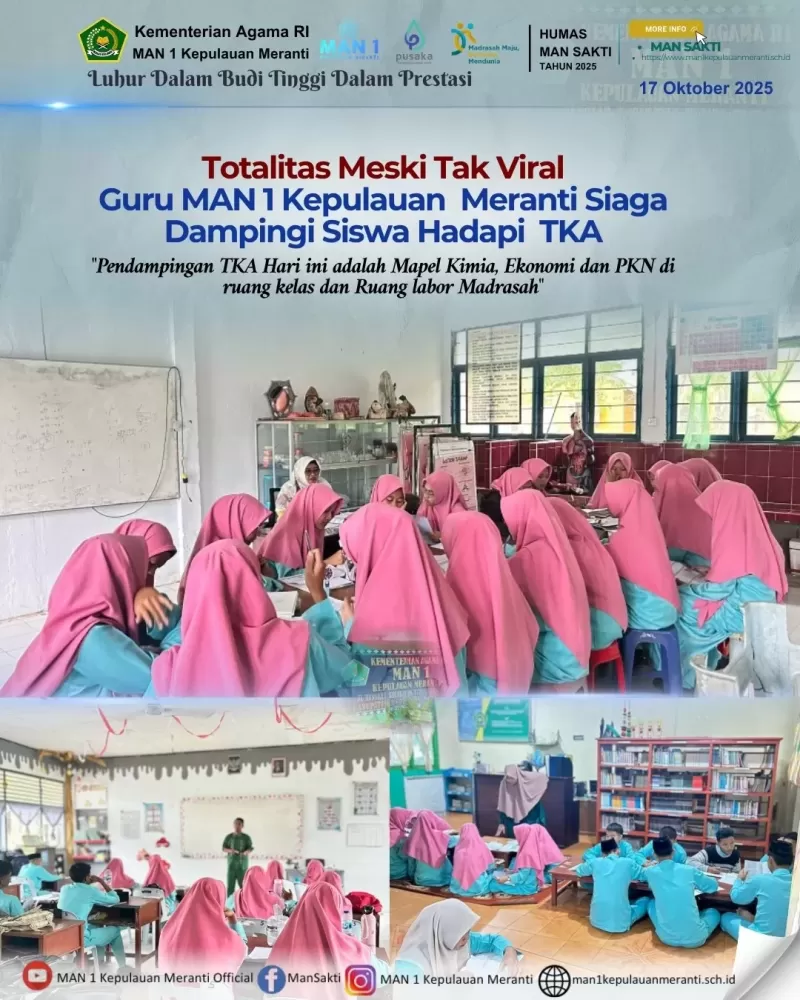 Selatpanjang (Mansakti) — Dalam rangka mempersiapkan peserta didik menghadapi Tes Kompetensi Akademik (TKA) yang akan digelar beberapa minggu mendatang, MAN 1 Kepulauan Meranti melaksanakan kegiatan “Totalitas Tanpa Batas: Pendampingan TKA Kelas XII” pada Jumat, 17 Oktober 2025. Kegiatan berlangsung di ruang kelas masing-masing mata pelajaran TKA dan diikuti oleh seluruh siswa kelas XII.