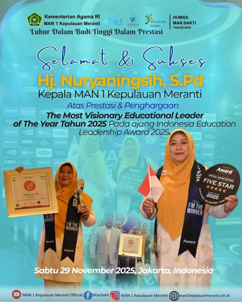Jakarta (Mansakti) – Prestasi membanggakan kali ini datang dari tingkat nasional. Kepala MAN 1 Kepulauan Meranti, Hj. Nuryaningsih, S.Pd, resmi meraih Indonesia Education Leadership Award 2025 sebagai The Most Visionary Educational Leader of The Year 2025 pada ajang bergengsi yang diselenggarakan oleh Awards Magazine di Aston Priority Simatupang Hotel, Jakarta, Sabtu (29/11/2025).