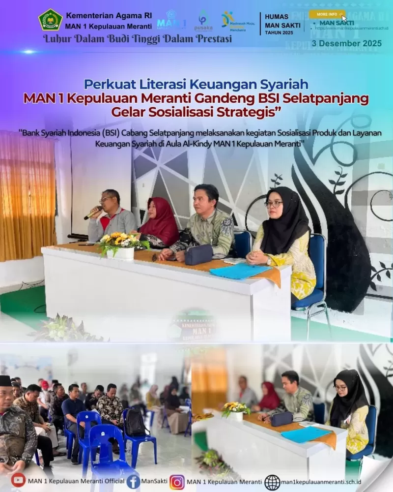 Selatpanjang (Mansakti)– Bank Syariah Indonesia (BSI) Cabang Selatpanjang melaksanakan kegiatan Sosialisasi Produk dan Layanan Keuangan Syariah di Aula Al-Kindy MAN 1 Kepulauan Meranti, pada Rabu, 3 Desember 2025. Kegiatan ini diikuti oleh seluruh tenaga pendidik dan kependidikan madrasah sebagai upaya meningkatkan pemahaman dan literasi keuangan syariah di lingkungan satuan pendidikan.
